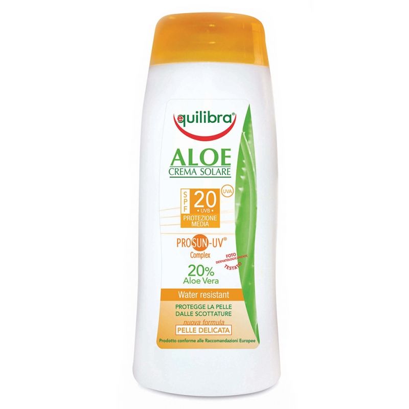 Equilibra® Aloe Sun cream SPF 20 PROSUN-UV® Complex protects the skin from burns and ensures a healty and natural suntan. Carrot oil and vitamin E stimulate the natural defenses of the skin. The tolerability of the phototested product is reinforced by the presence of aloe and the absence of perfume.