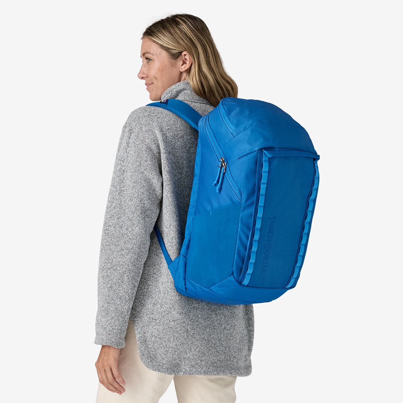 Top-mounted, reinforced haul handle; two stretch-woven side pockets hold water bottles or guidebooks; front daisy chains for lashing