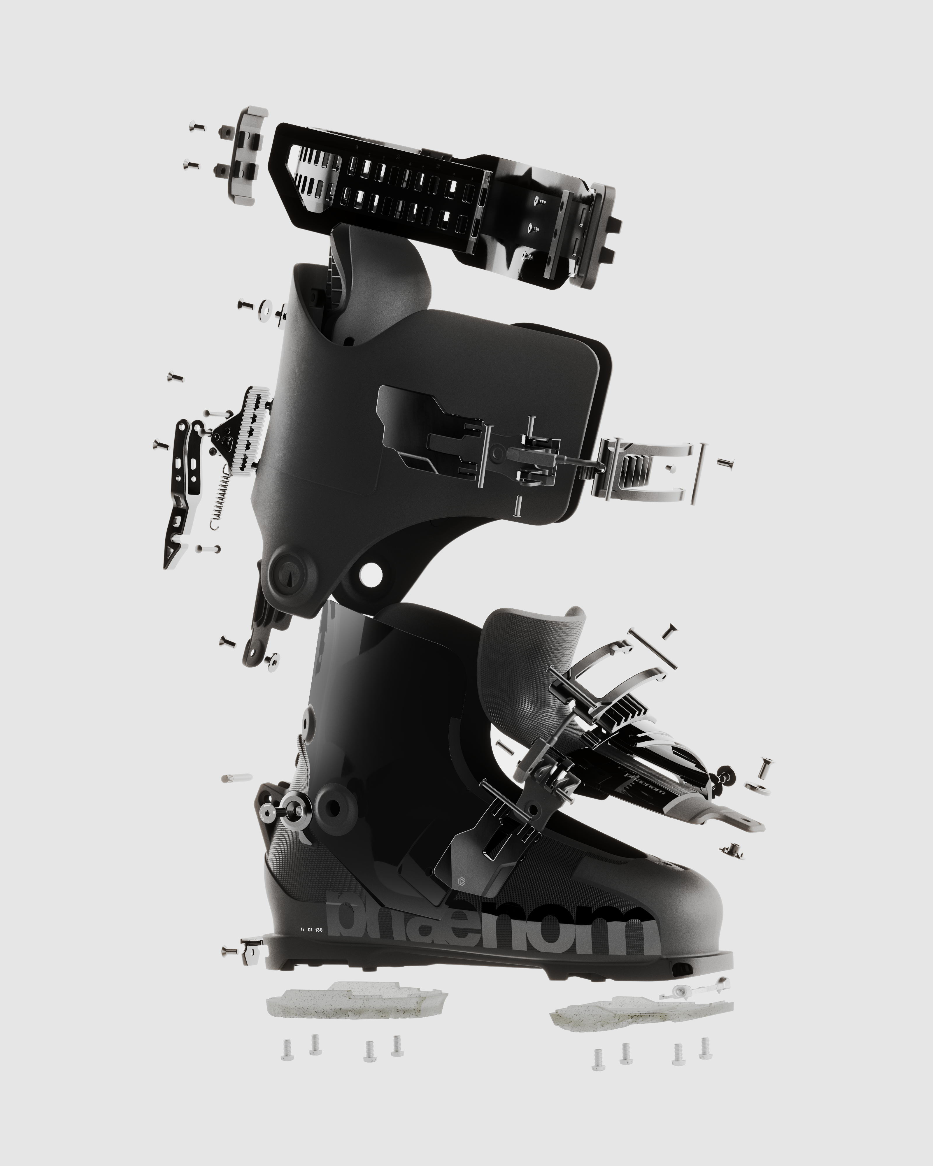 The sleek all-black design supports restoration and reuse of the boot and its parts. Each element of this product — from panels to buckles to straps and screws — is designed to be repairable and recyclable.